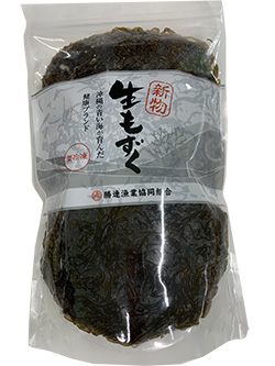 新鮮生もずくは、一番美味しい時期に収穫されたもずくです。一般的なもずくに比べてぬめりと食感の良さが特徴です。一般に流通している塩蔵などの加工に不向きなため、 県外にはほとんど流通していません。収穫時期も 3 月~4 月初旬と限られており、いままでは地元の漁師しか食べることができない希少な生モズクとして重宝されてます。
