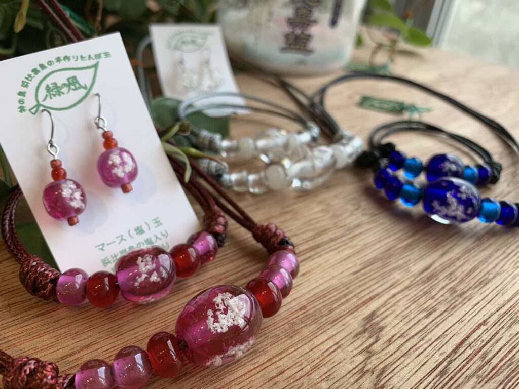 マース玉は、ガラスの中に塩をとじ込めて、魔除けとしてお持ちになることができます。とじこめている塩は浜比嘉島で作られた高江洲製塩所の非常にパワーのある塩を使用しています。