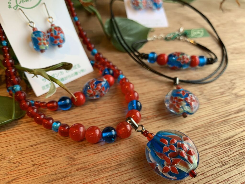 うるま市の市花である「サンダンカ」をモチーフに、とんぼ玉で表現しています。 製作しているのは神の島 浜比嘉島です。サンダンカには、「神様からの贈り物」 という花言葉があります。まさに、浜比嘉島で作る玉にピッタリのモチーフです。